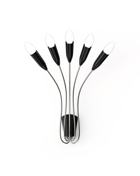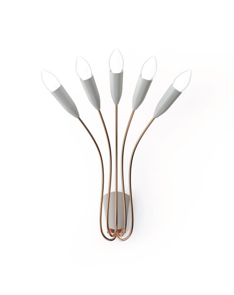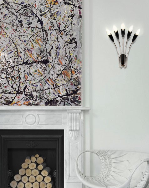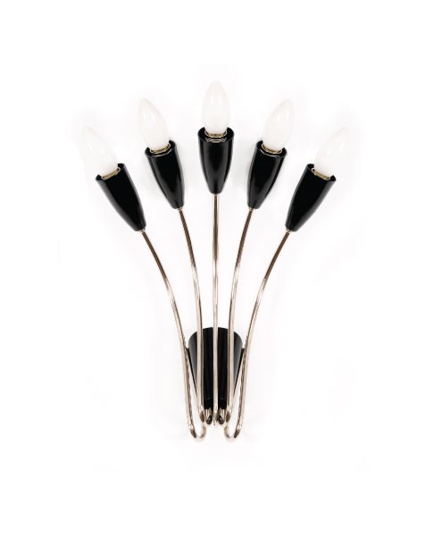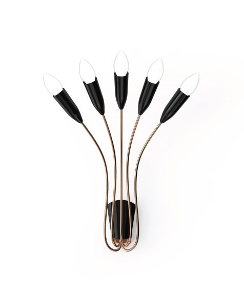 Due to its delicate and curved forms, Norah wall lamp has a vintage style that will transmit a sense of elegance and sophistication in every single space. This decorative wall light consists of five fixed arms made of brass with nickel plated and glossy black finishes. The wall lamp bulb holders are made in aluminum with a matte black finish. With five bulbs, this interior wall sconce includes E14 Bulbs (E12 for USA, not included). You can customize Norah with any RAL color of your choosing, in order to adapt this interior wall light to every room in your mid-century modern design. Going as high as 15.7 inches, Norah wall lamp will sit beautifully next to a piece of art in your living room decor.