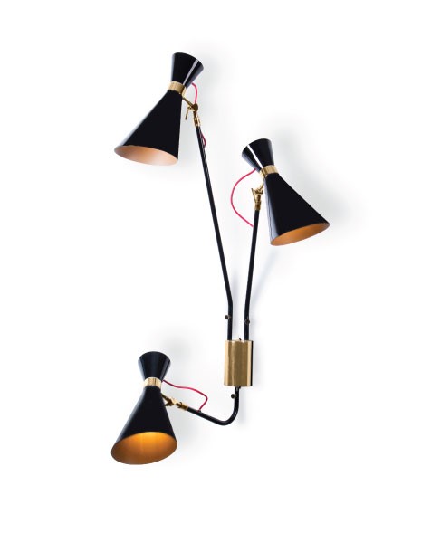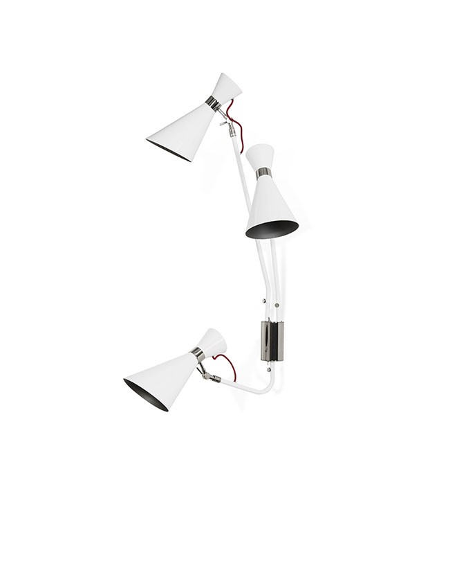 Simone wall lamp has a sleek, utilitarian design that brings a vintage flair to mid-century modern interiors. With a glossy white shade and a textile red wire, the vintage wall light fits in with a wide array of color schemes and styles. The three fully flexible arms are made of aluminum and the structure in brass, boasting three cone lampshades with gold plated accents. This mid-century modern sconce is easily changeable when in need of a reading light, especially as a bedside lamp, or if you are simply looking to light up your hallway.