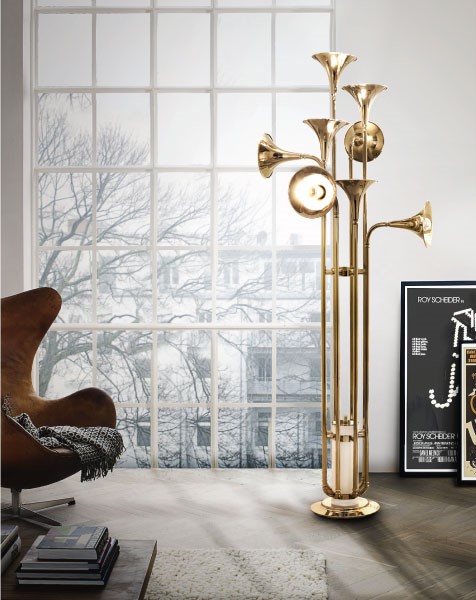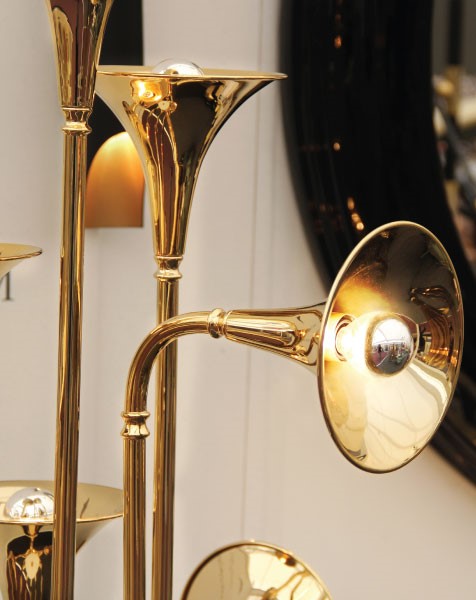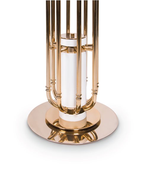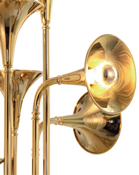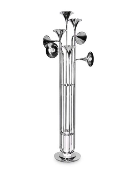 Botti floor lamp was inspired by the jazz musician of Chris Botti. The mid-century floor lamp is handmade in brass with a gold plated finish that reminds of a real trumpet due to the its unique shape. With an aluminum base, this modern floor light can be customized in marble, giving an even more luxurious design to your mid-century modern interior. This brass floor lamp has eight spotlights which offer a soft lighting, and goes as tall as 70,9 inches. Botti art deco floor lamp showcases a high-quality craftsmanship, that will definitely make a statement in your sophisticated classic living room design or mid-century hotel lobby. Botti contributes a jazzy and mid-century vibe as does the gold plated and white glossy finishes.