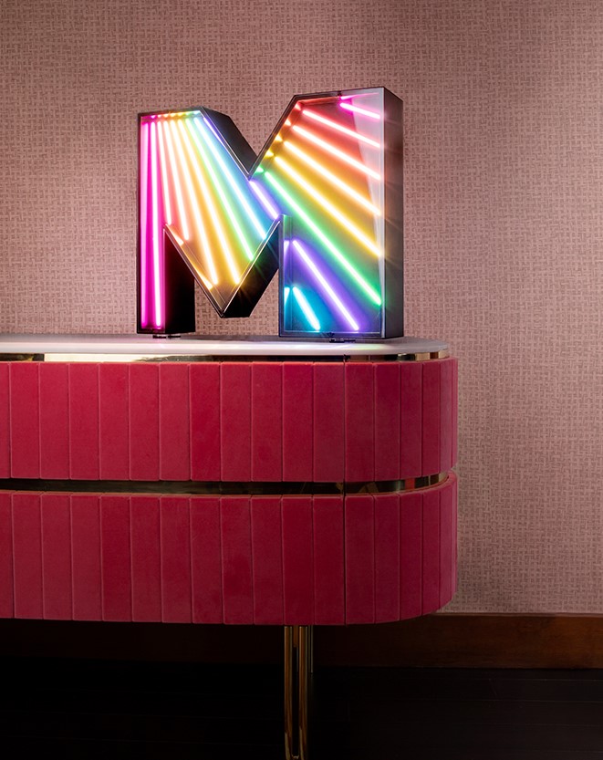 An eye-catching touch to a big, bold and bright marquee letter design. A unique way of bringing a unique, colourful and cheerful touch to any exterior or interior design project. With its stunning rainbow neon effect, this versatile lighting design can be placed in the wall or on the floor. Coming with a large anti-reflective acrylic panel to protect the neons this marquee letter design has 1 meter and its handmade in acrylic and aluminum. Customizable on demand it's also available in a mini version, this marquee letter is perfect for a fun lobby.