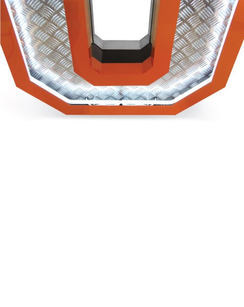 Inspired by the great 70's, the geometric lines and the exterior orange underlines that contour the aluminum fixture is a sign of the times ahead. Covered with diamond plated steel that reflects the white neon glow of the marquee lighting design is the ones to characterizes this lighting fixture. Creating a new aura in any design project, this handmade lighting design has a 1 meter in height. Versatile, you can put this lighting design on the wall or on the floor. Fitting for outdoors as well, you can customize your lighting design on demand.