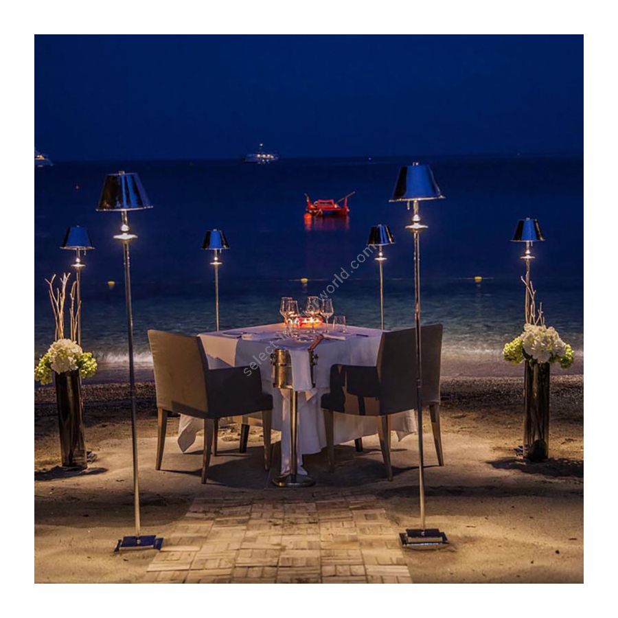 Designed by architect Michele Bönan, this charming battery operated floor lamp combines traditional style with a refined modern aesthetic. Featuring a polished chrome finish (dark brushed bronze and brushed bronze), it has a brass structure consisting of a square base and a long stem topped with an elegant all-metal shade. Lighting with 3 x 1.2W LEDs. Lamp supplied with international plug kit.