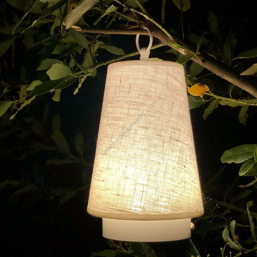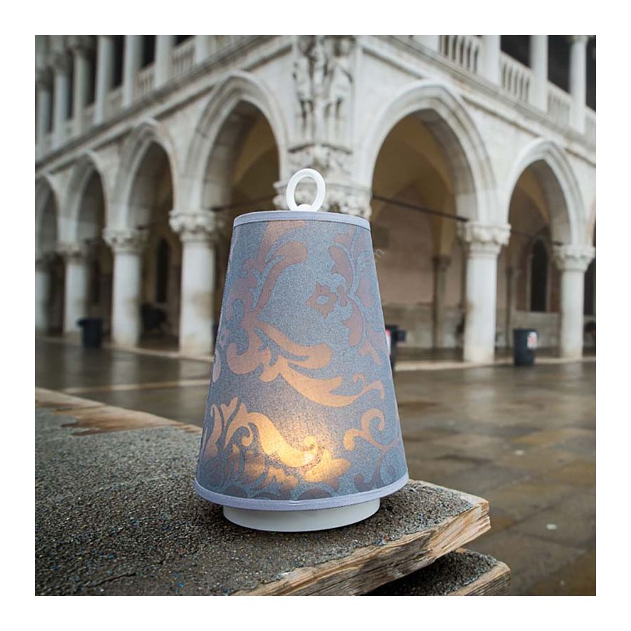 STARLET table lamp in conical shade. Base in sheet metal lacquered white colour complete with shade disk in plexiglass. Shade in various fabrics and colours. For indoor and outdoor use.