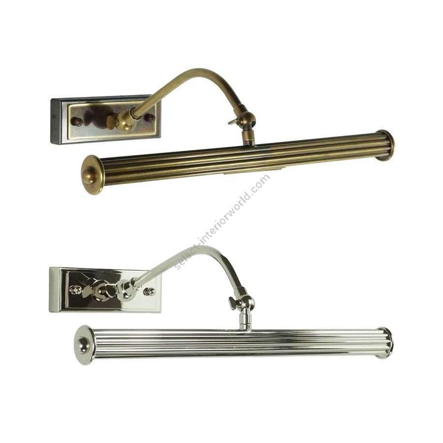 Lamp for wall installation mounting bracket for fixing at wall. Picture light in brass metal or polished nickelwith a double swinging arm.