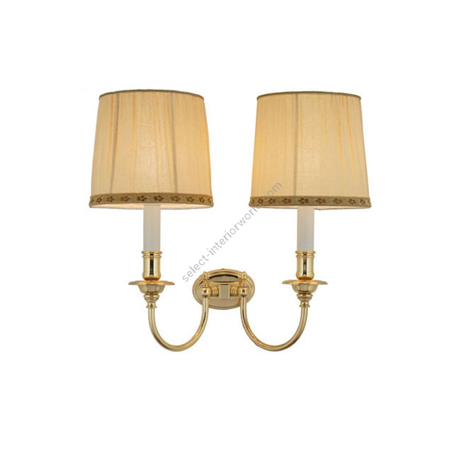 Wall lamp with two lights in polished brass, fabric lamp shades.