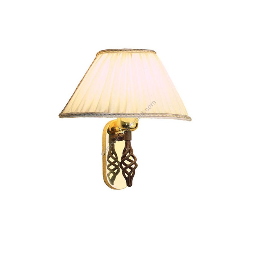 Wall lamp in polished brass with metal decorated details, fabric lamp shades.