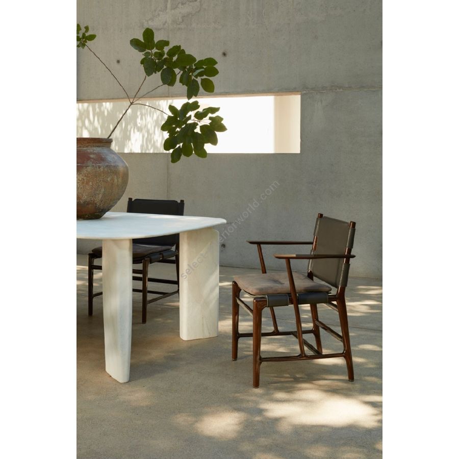 Levante Chair is crafted from hand-carved mahogany, a noble and resistant wood shaped into light, flowing forms. Genuine outdoor leather defines seat and backrest, while optional armrests and artisanal joints highlight a design rooted in Italian craftsmanship and natural inspiration.