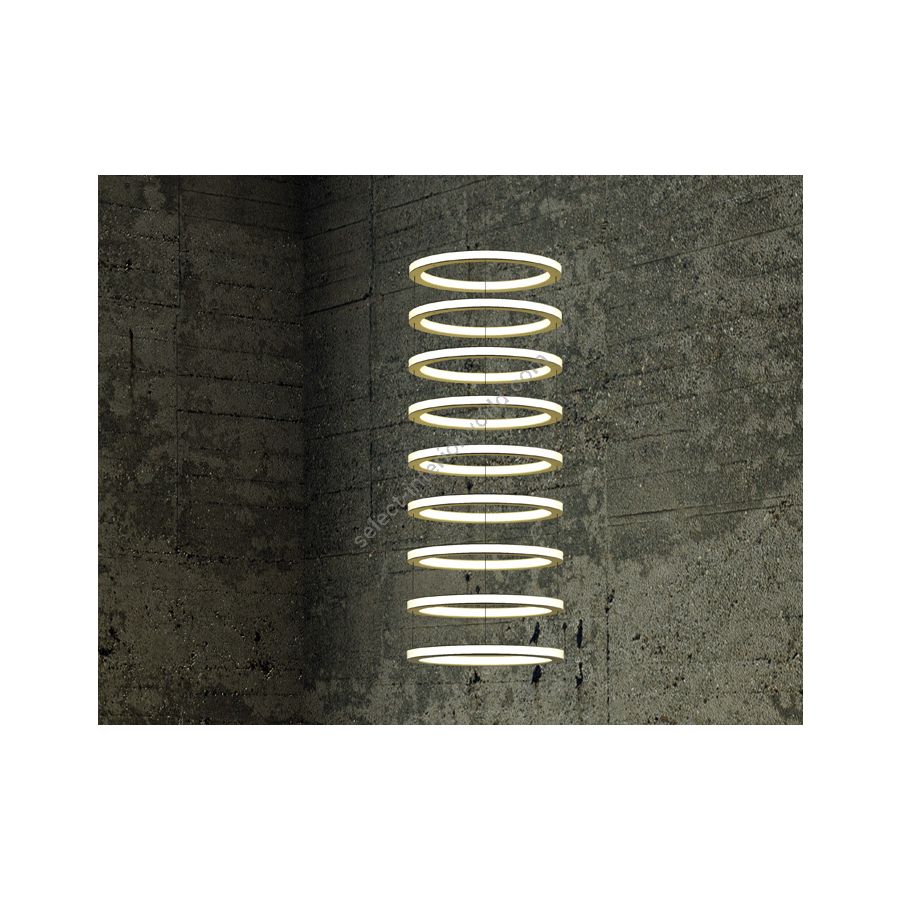 The set of suspension luminaires is a work composed of metal rings, adorned with brass details. Each ring contains an opaline acrylic diffuser both on the outside and inside, allowing for uniform diffusion of a warm, integrated LED light source. This meticulous composition offers exceptional versatility: by combining the five different ring diameters, a wide range of possible volumes and shapes are displayed.