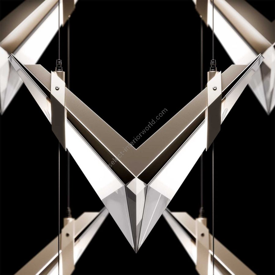 Inspired by the bold geometry of chevron shapes and the sleek lines of modern aircraft, Blade brings a sense of motion and precision to lighting design and merges sleek design with modern functionality. Pendant features cut crystal and integrated LEDs in Standard Black Iron or Champagne finish. Dark Walnut stained wood featured on select items adding warmth to the metal forms.