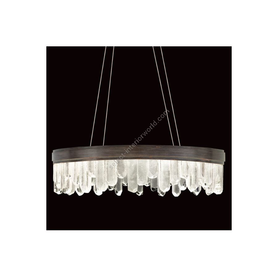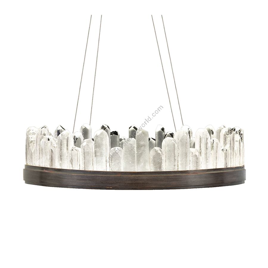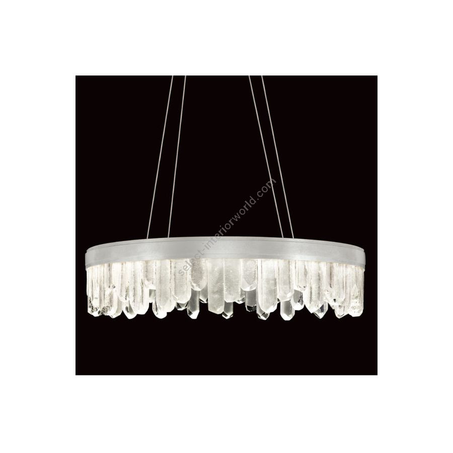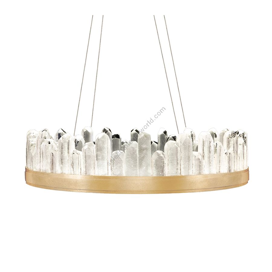 Reversible LED pendant influenced by the ephemeral appearance of illuminated rock crystal, which has been interpreted into handmade glassworks with the collaboration of the Fine Art Lamps studio glass master craftsmen. Formed of glass spires that mimic natural crystal formations as much as they do rays of sunlight, and clean metal lines in unadorned but precious finishes. Available in silver leaf, gold leaf and patinated bronze in either 3000K temperatures.