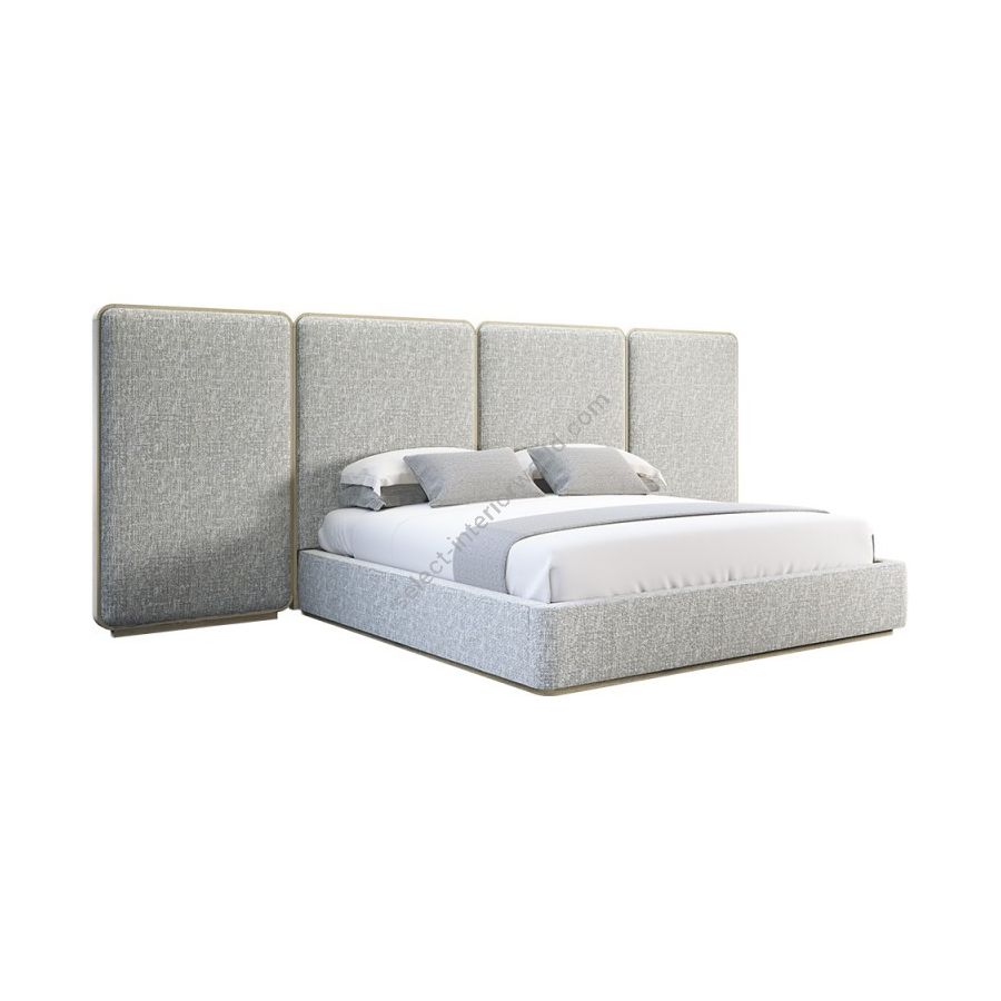 The upholstered base is complemented by the panels and makes the bed a fully upholstered piece with certain wooden details, which join the panels and highlight the silhouettes. The base has rounded corners and the panels can be upholstered in fabric or leather.
