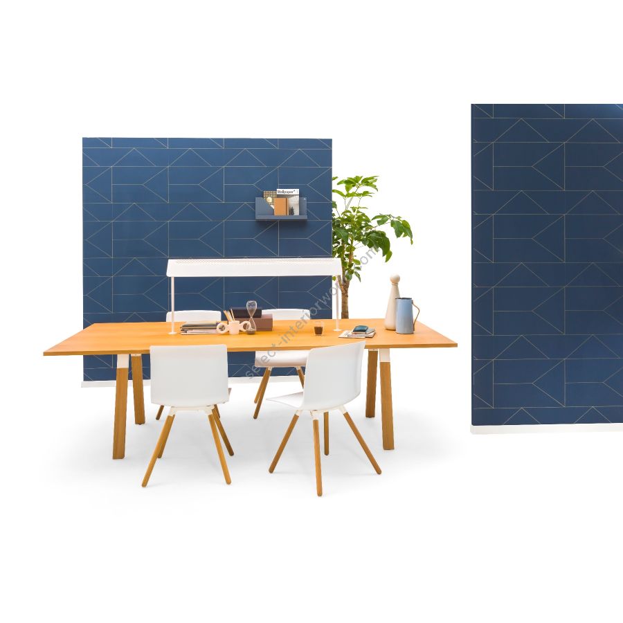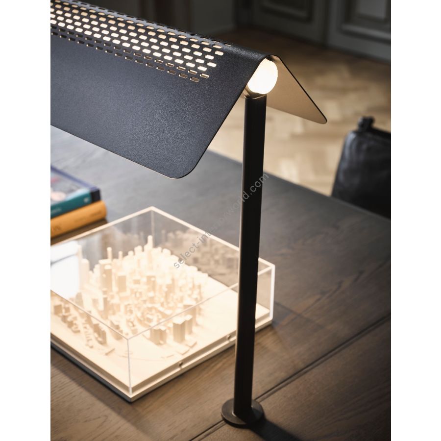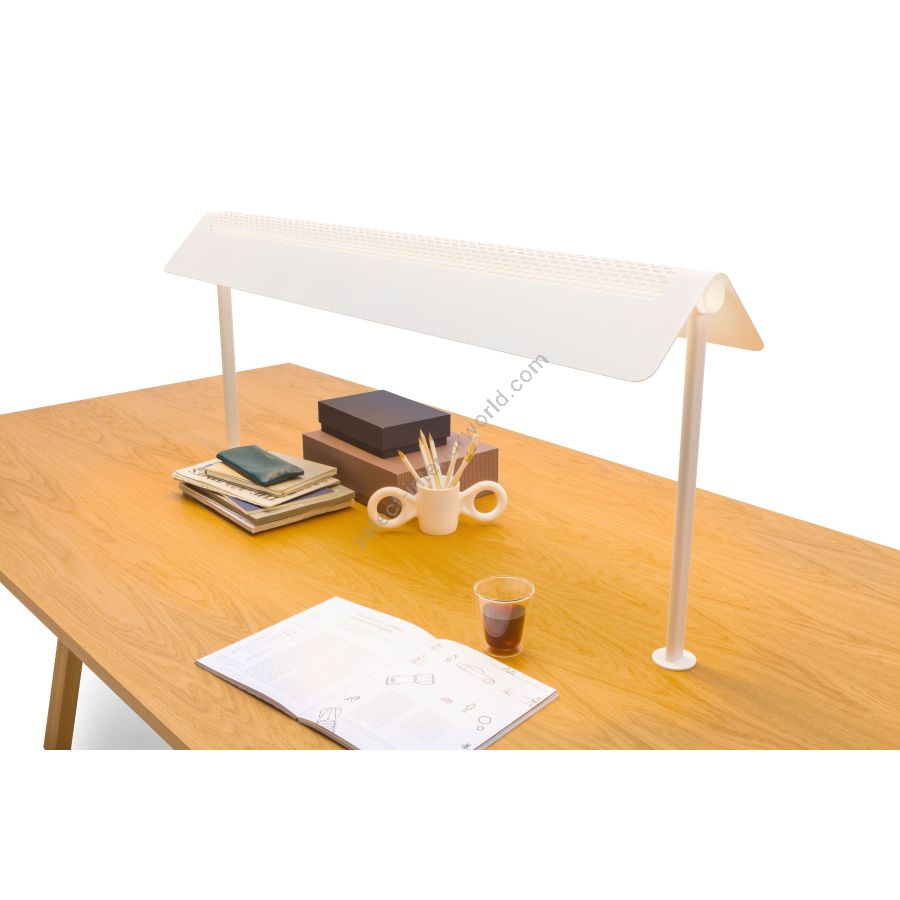 Flybye T2 is a long version table lamp for use on library tables, workstations or on communal table. The position of the shade provides natural separati-on and privacy. The shade has a perforated laser-cut pattern with a targeted shape. The shade rests on a high quality LED tube with warm white light. The two elements together provide functional direct light of excellent quali-ty. Because the hood is perforated on top, the Flybye also provides indirect light.