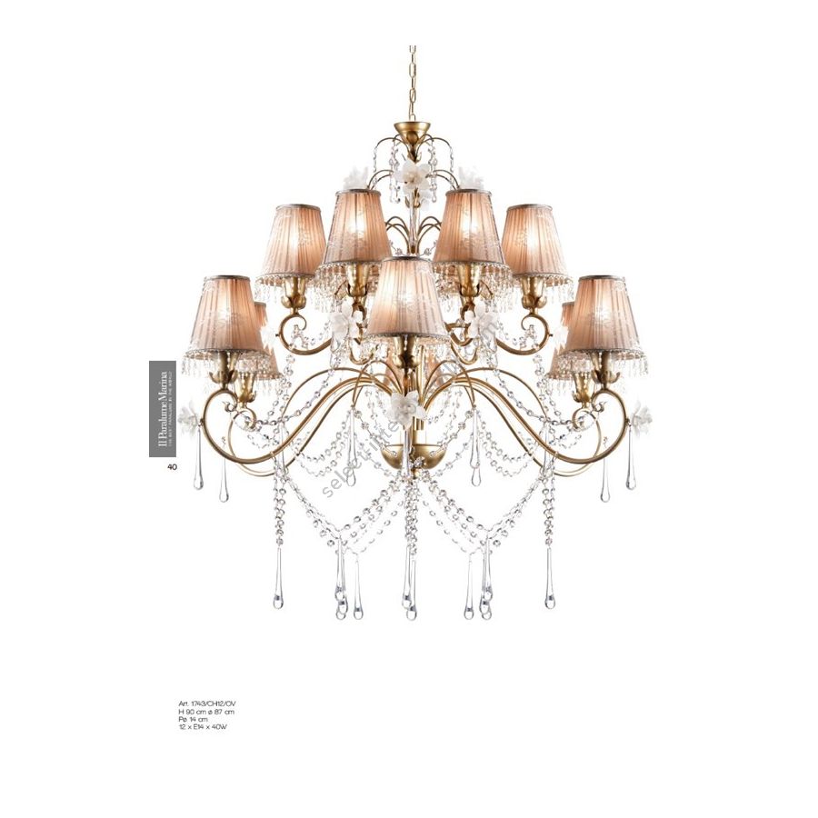"Pearl" Collection: 12 lights chandelier in gold metal, decorated with Murano glass flowers and drops and hand-made lampshades. All enriched with crystal pendants. Lighting item that diffuses the light with great effect in the surrounding environement creating a warm and welcoming atmosphere.