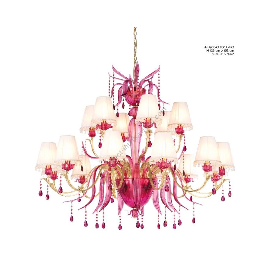 18 lights Chandelier with red Murano glass. Lighting item that diffuses the light with great effect in the surrounding environement creating a warm and welcoming atmosphere.