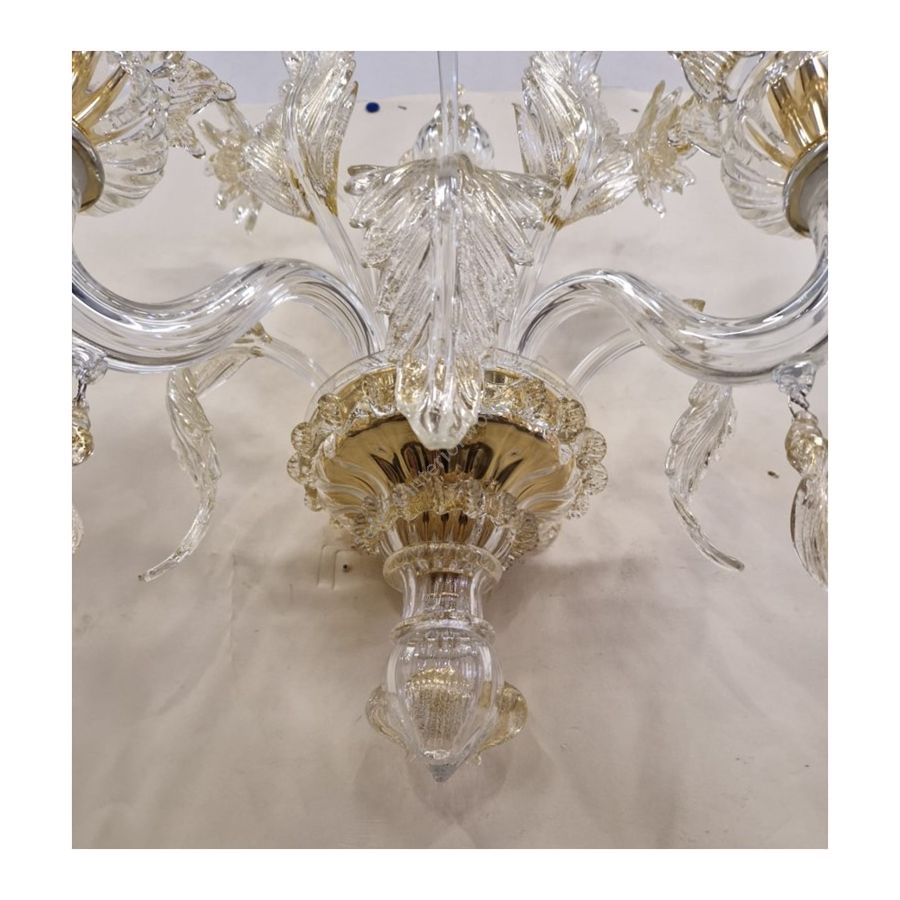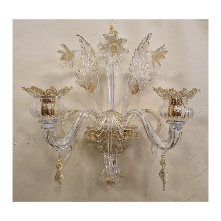 Murano Glass wall sconce with decorations in transparent + gold powder. Lighting item that diffuses the light with great effect in the surrounding environement creating a warm and welcoming atmosphere.