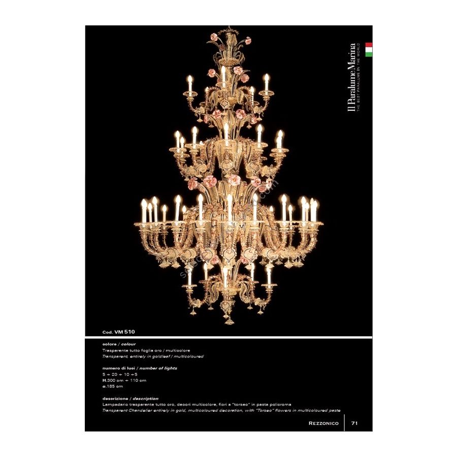 All-gold transparent chandelier, multicolored decorations, ""torseo"" flowers in polychrome paste, 5 + 20 + 10 +5 lights. Lighting fixture that diffuses the light into the surrounding environment with great effect, creating a warm and welcoming atmosphere.