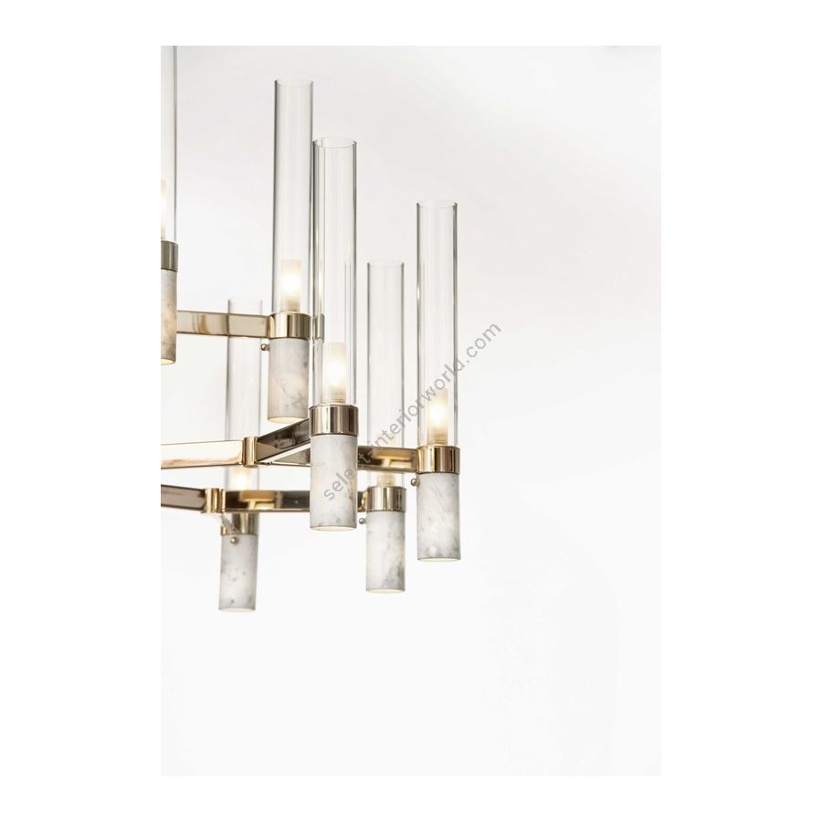 Chandelier with grey veined Carrara marble and borosilicate glass. Lighting item that diffuses the light with great effect in the surrounding environement creating a warm and welcoming atmosphere.