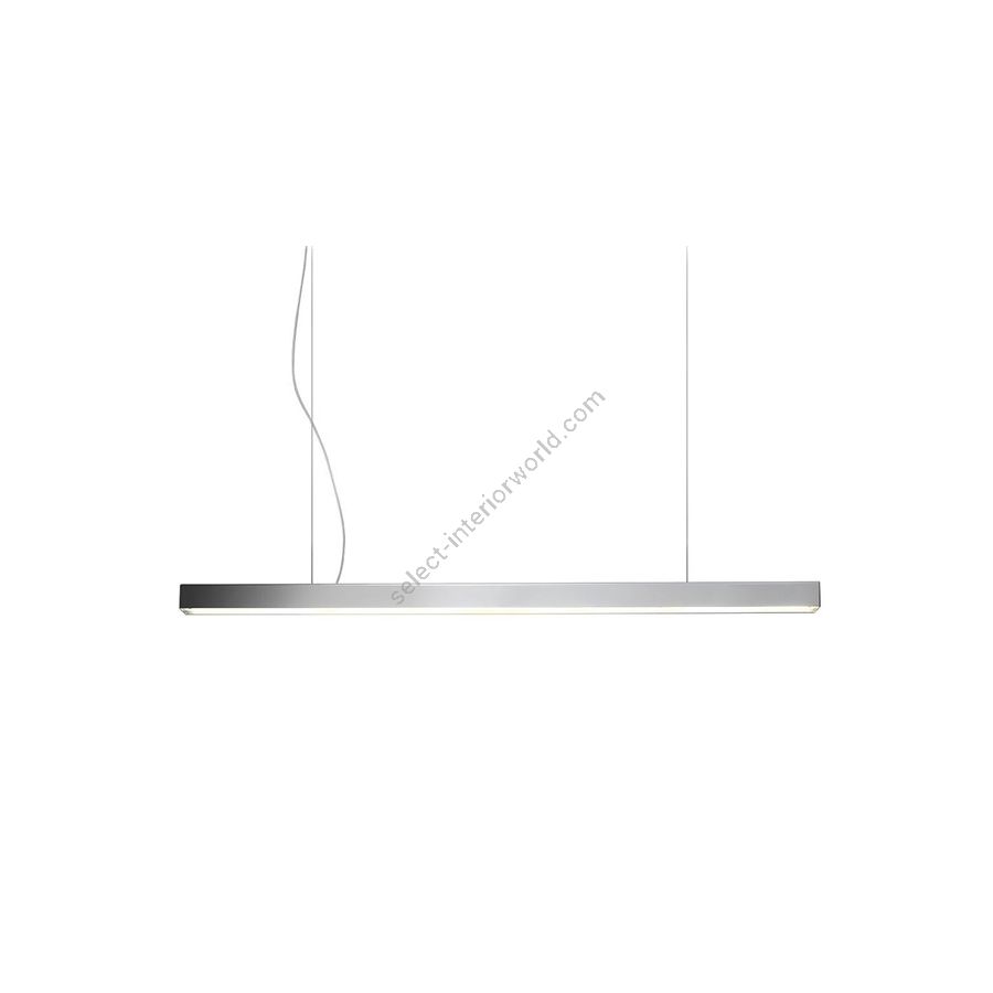 Square metal bar with LED lighting and polycarbonate diffuser. Strip led 17 W/m (tot 51W-2625 lumen) + internal power supply to the bar, steel cable on ceiling. Lighting item that diffuses the light with great effect in the surrounding environement creating a warm and welcoming atmosphere.
