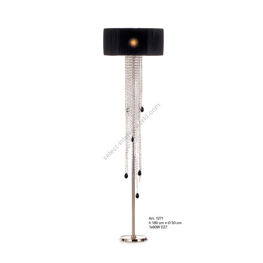 Floor lamp with cylindrical lampshade and crystal pendants. Lighting item that diffuses the light with great effect in the surrounding environement creating a warm and welcoming atmosphere.