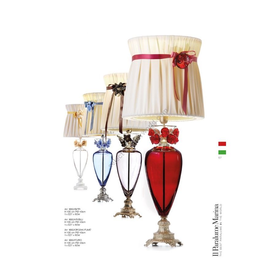 Table lamp in red Florentine crystal and cast brass. Decorated with red Murano glass flowers and lampshade in double fabric with silk ribbon and glass flower. Lighting item that diffuses the light with great effect in the surrounding environement creating a warm and welcoming atmosphere.