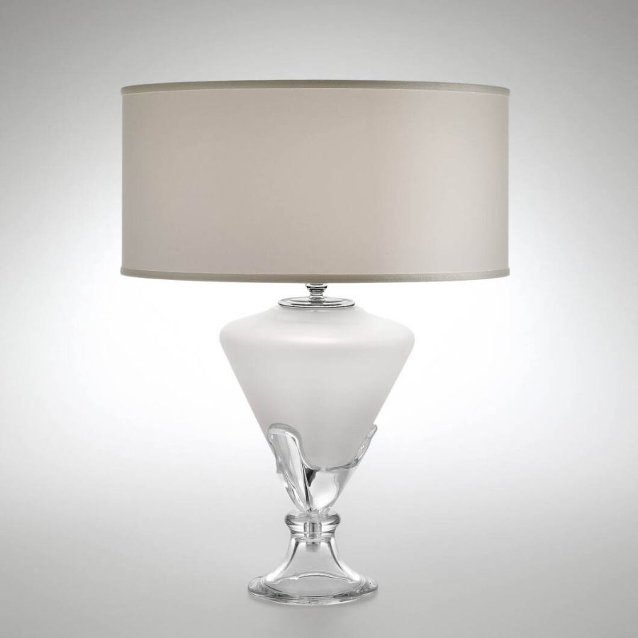 Table lamp in overlaid crystal with clear or amber crystal base, ivory fabric shade. Metal details with nickel finish.