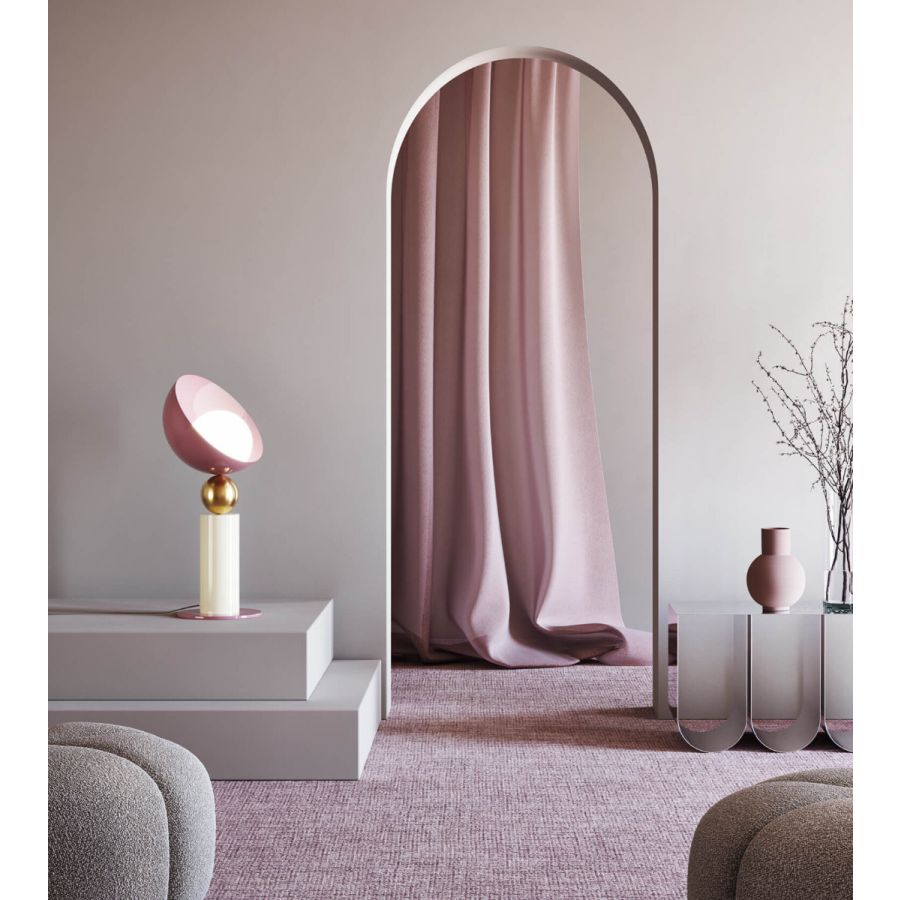 Aurora is a table lamp with structure and decorative parts in metal available in Ancient White, Yellow Sunrise, Baby Blue, Baby Pink and Cappuccino. Middle sphere with brushed light gold finish. Diffuser in white glass.