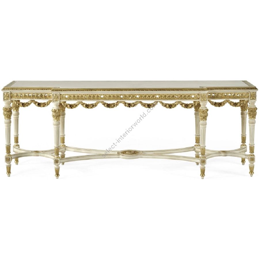 An emblem of artisanal excellence, the Guirlande console enchants with its rich garlands and slender columns, highlighted by luminous gold accents. The console rests on eight carved legs connected by a cross structure, finished in patinated white lacquer. The top in marble completes the piece, offering a harmonious blend of classical inspiration and eclectic aesthetic.