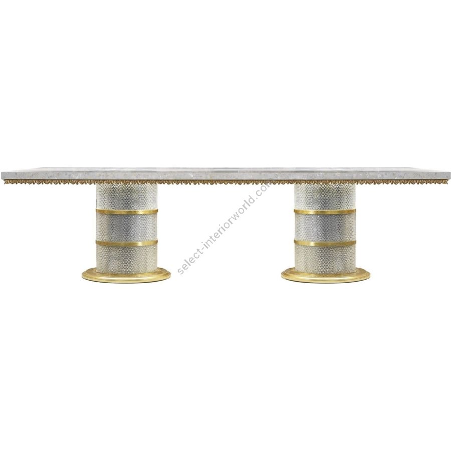 A refined combination of styles and precious materials gives life to a table with a great visual impact. Coquille is characterized by a base with a glossy gold finish with cut glass columns with led lighting. The top is in mother of pearl with refined hand-made gold inlays. The result is a scenographic table suitable for settings with a classic and luxurious charm.