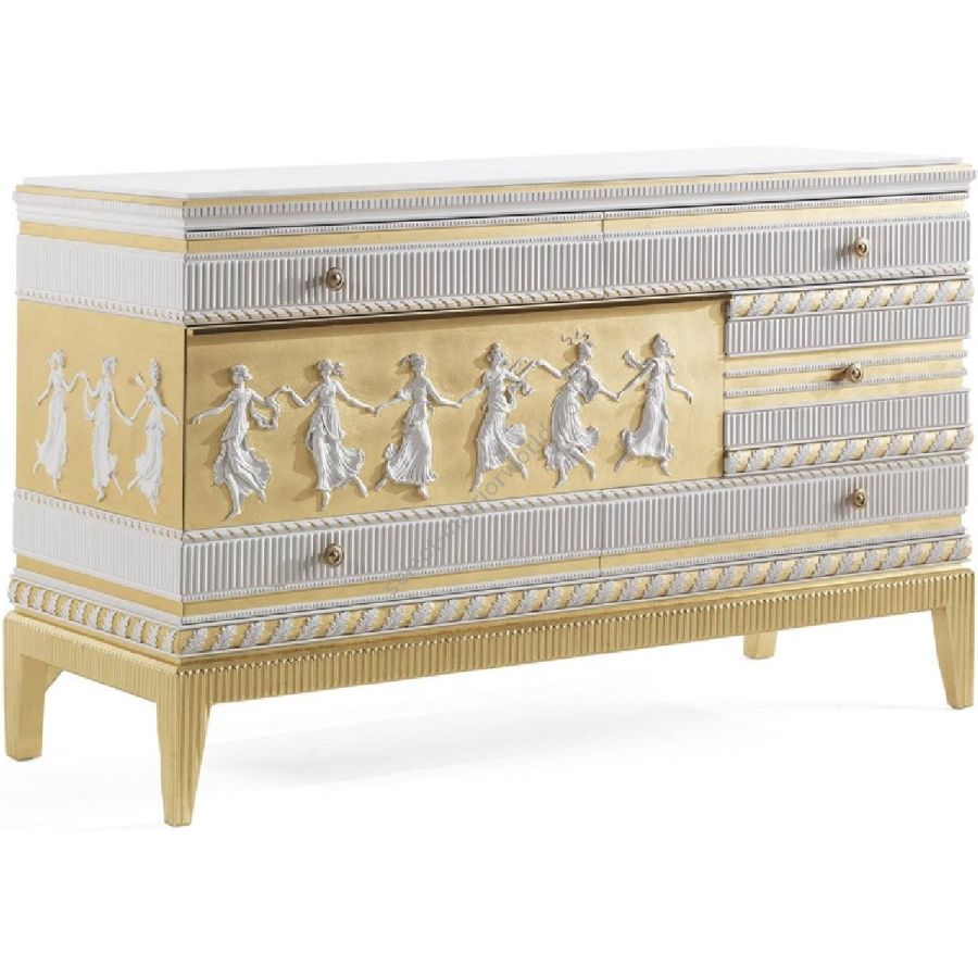 Portland is a delicate and refined line of furnishings, characterized by decorations that recall the world of Wedgwood ceramics. The ornaments with a classic charm are further enhanced by the lacquer finish with biscuit porcelain effect which lends the designs an opaque and rough effect, while the glossy opaque gold leaf gilding further enriches and enhances the pieces of the line.