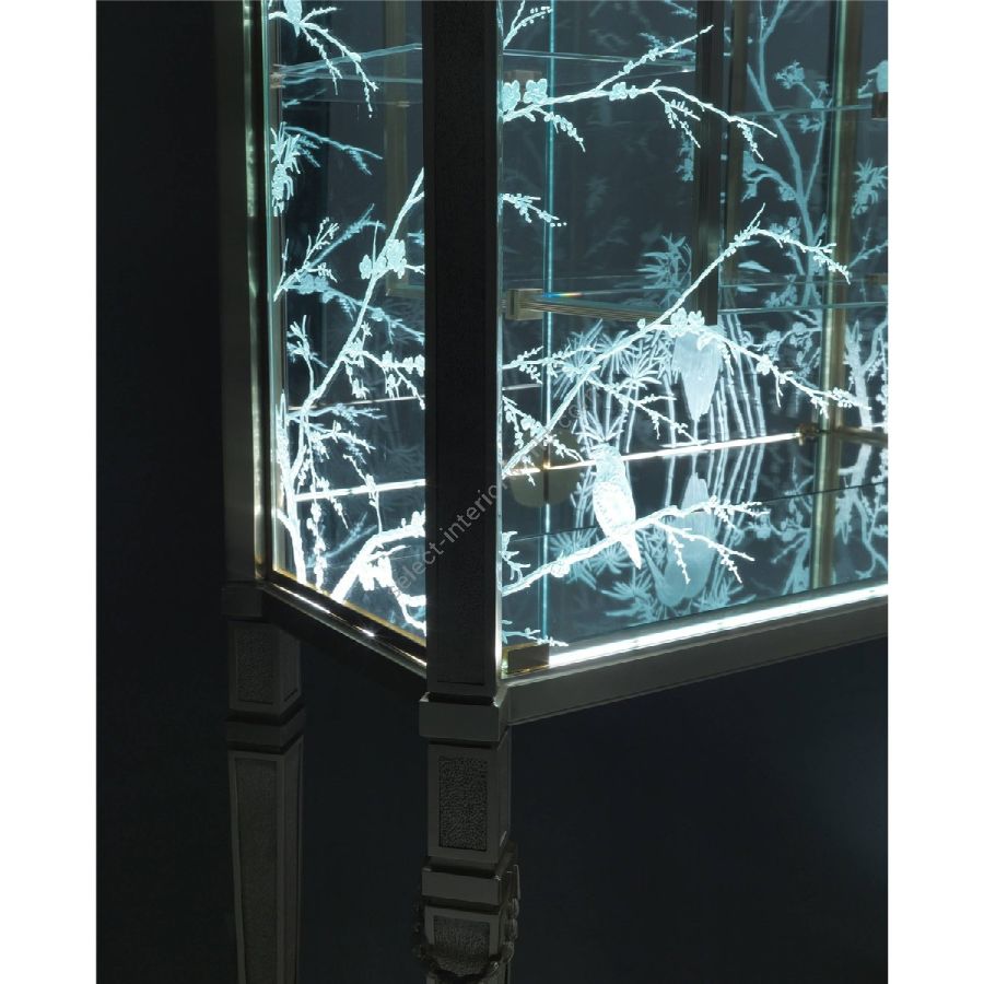 The special manufacturing of the glass, engraved in several steps and with different depths to give a three-dimensional effect to the design, is the main feature of the furnishings of the Fuji line. The decorative motifs, inspired by the oriental world or by the classic western decorativeness, give the pieces a refined charm. The lighting of the piece through the thickness of the glass enhances and emphasizes the engraved designs.