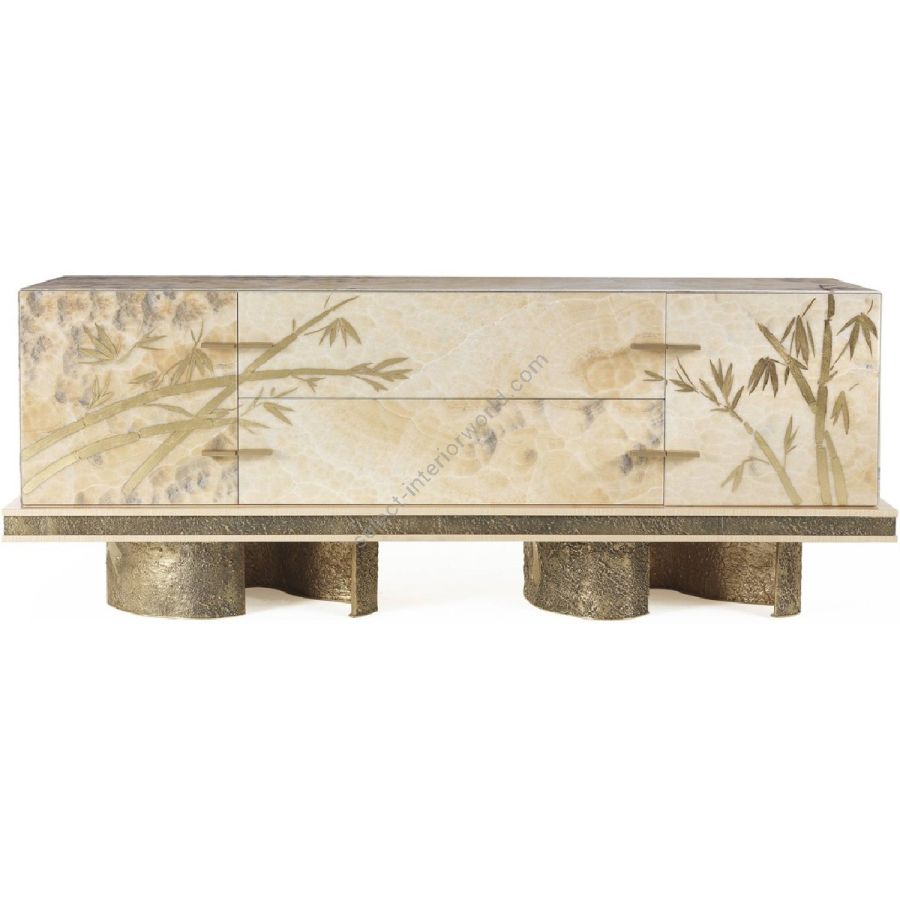 Characterized by sculptural shapes, the pieces of furniture of the Shinto line combine the essence of classic style with a contemporary allure. The pieces are distinguished by an original combination of materials, including natural maple, precious marble and brass casting. The parts in brass castings, with their materic appeal, contrast with shiny components in onyx or marble, enriched with refined decorations in gold leaf. All the pieces are characterized by an important artisanal component: the manufacturing mixes the use of experimental techniques with traditional methods handed down for centuries.