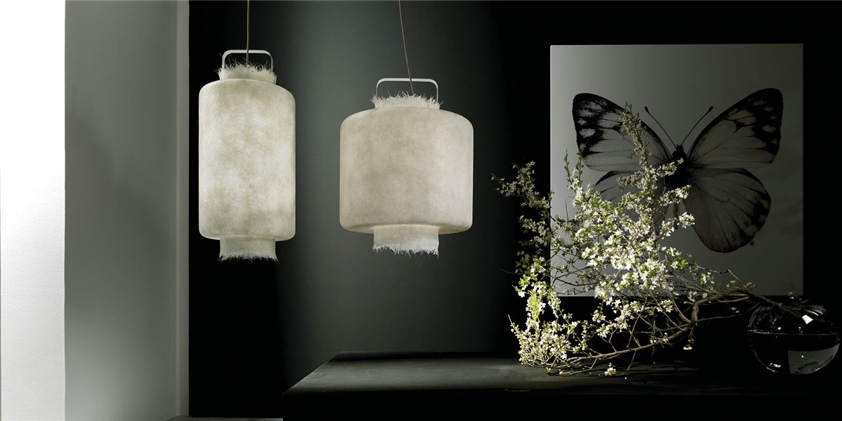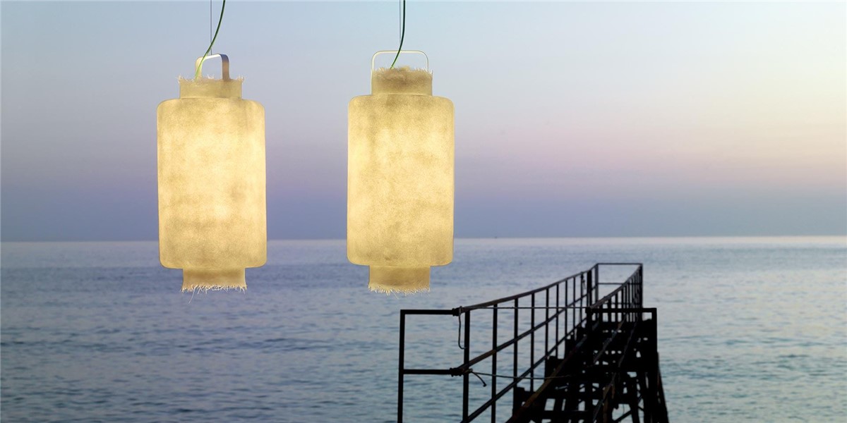 With its simple yet striking transarency, Kimono is a pendant lamp inspired by Japanese lantern. Made of white fiberglass, it is available in two shapes and sizes for indoor and outdoor use.