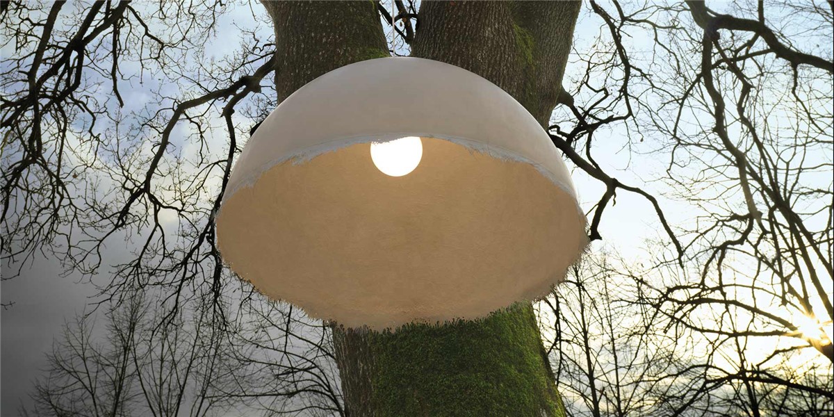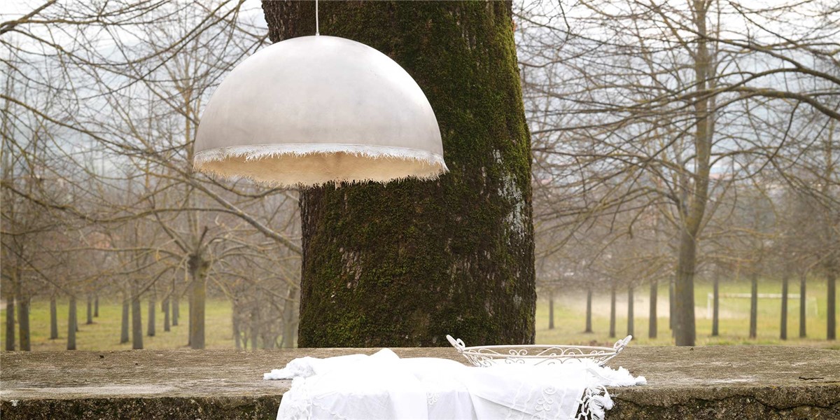 A series of hanging lamps made of white fiberglass for interior and exterior use. The structure is light, and the shape of the cap creates a brilliant light that propagates softly in the environment through athe thousand shades of its substance. Available in two sizes.