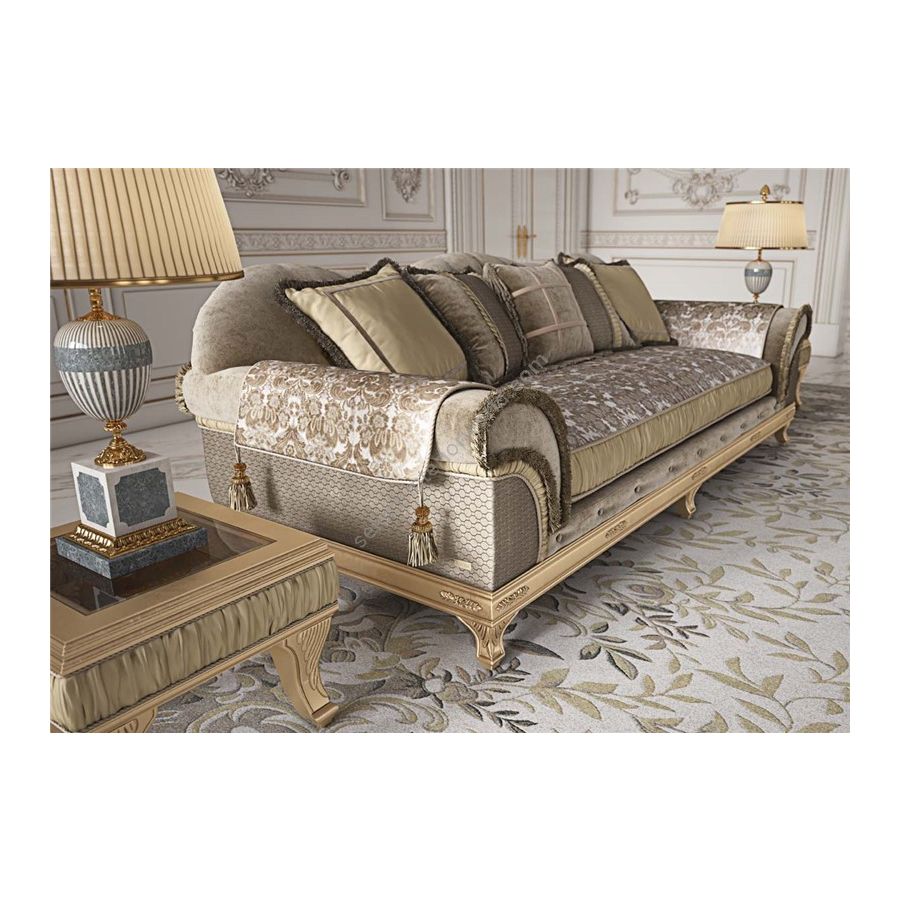 Sofa with a semiremovable seat covering. Fir wood and poplar multilayer structure. Non-deformable polyurethane foam upholstery with different densities. Reversible seat cuschions with down filling and SUPER-SOFT-SYSTEM springs. Armrest coverings, two upholstered cuschions and beechwood feet. Upon request cuschions and backrests adorned with fringed ribbon. Finish in gold or silver leaf with a choice of premium price. There is a bed version with one electro-welded standard support with H12 spring mattress.