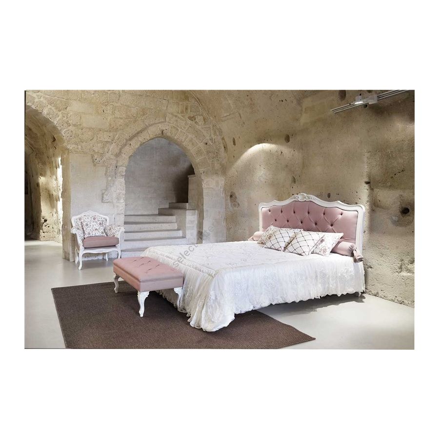 The structure is made of beech, whilst the upholstered headboard and frame are made of poplar multilayer. The orthopaedic metal mesh base is included in the price (mattress not included). The finish in gold leaf is not included in the price.
