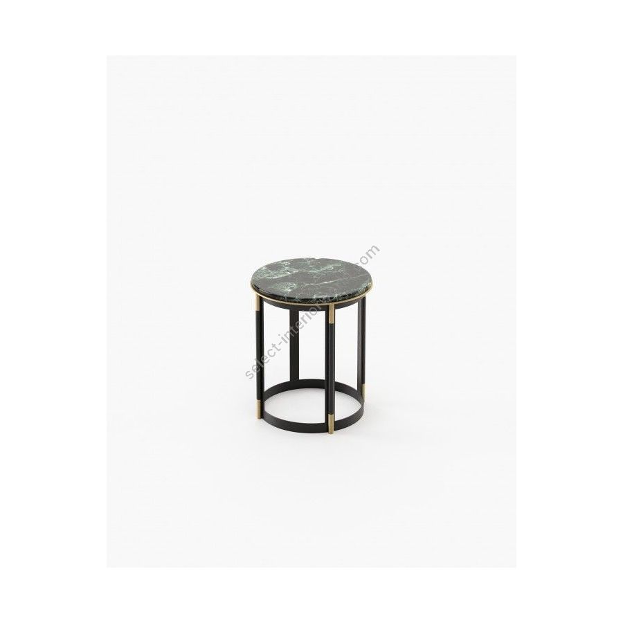 The Lyssa side table boasts a strong geometric design with a metallic structure, metallic details, and a marble top crafted by skilled Portuguese artisans. It's an ideal piece for elegant living rooms.