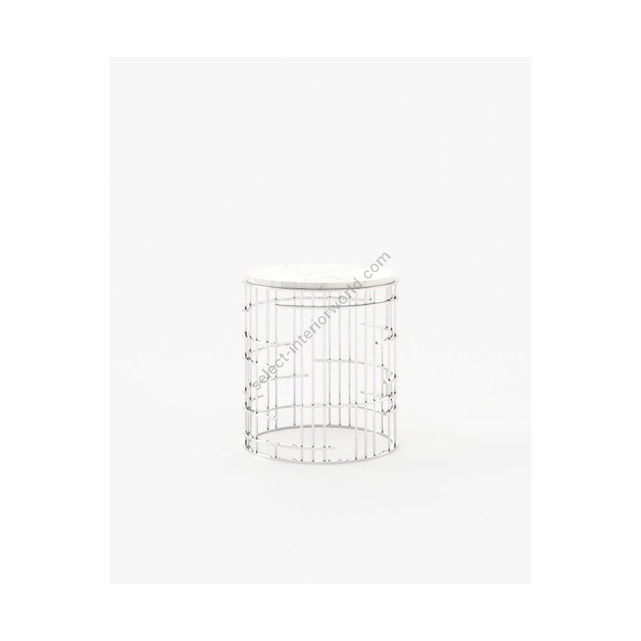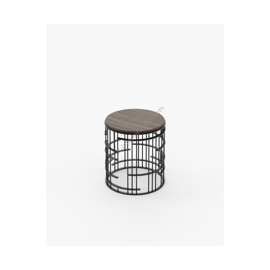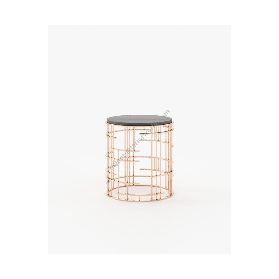 The Mercy side table is a geometric masterpiece, featuring a round tabletop, metallic structure, and an asymmetrical line body.