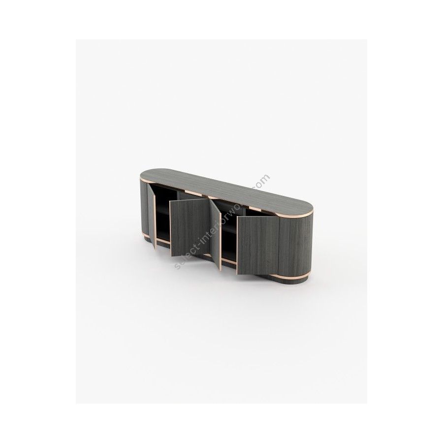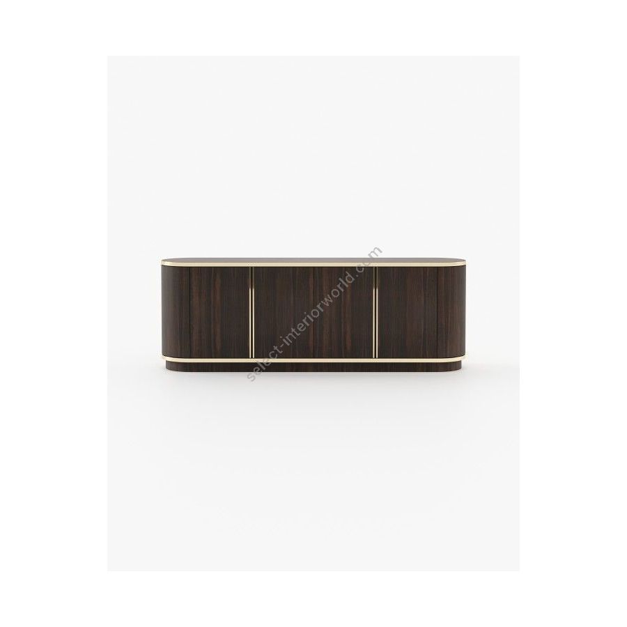 The Brown sideboard is elegant and refined, featuring a wood surface, trimmed metallic details, and a curved design body with a handcrafted marble top. It is a unique piece for outstanding dining rooms.