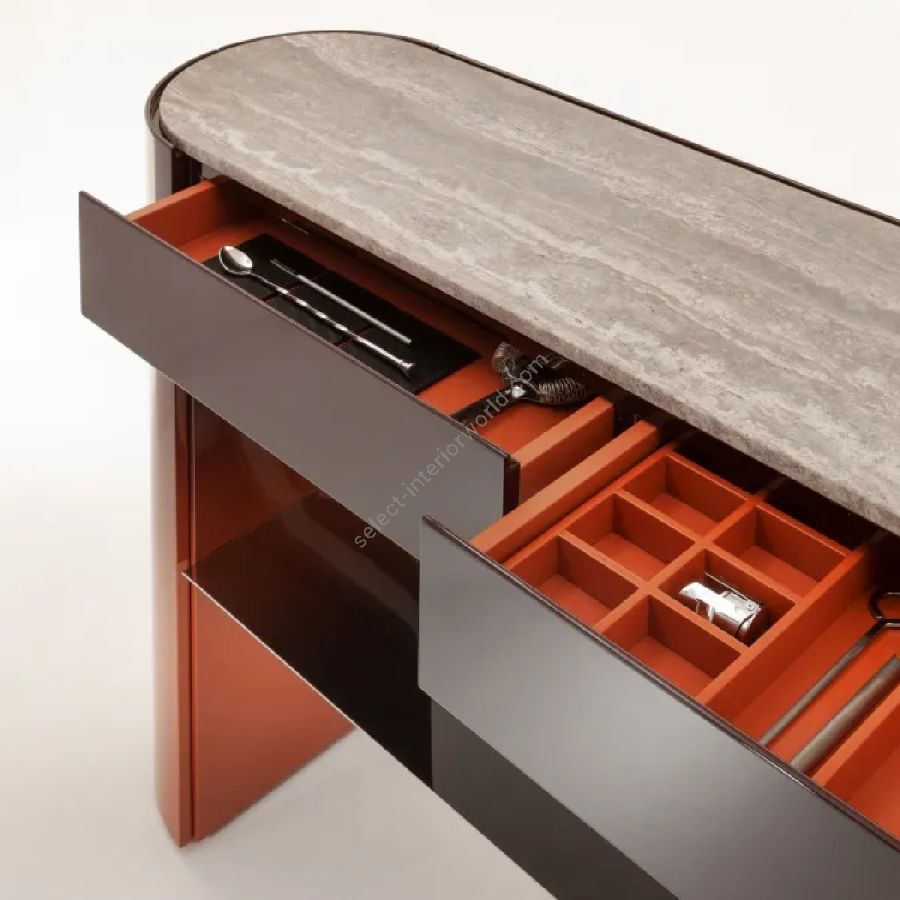 Console with curved sides, marble top, and polished steel under-top. Equipped with storage compartments with integrated hinged doors in the legs and featuring two drawers.