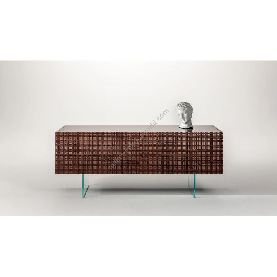 Maxima sideboard with carved hinged or flap doors and structure covered in liquid metal. Legs in extra-clear glass and top in back-lacquered glass. Plain wood interior.