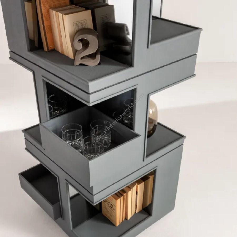 Column made of wood or with a concrete-effect finish, which accommodates a series of removable trays in polished steel, or in concrete-effect, in several compartments made in different sizes.