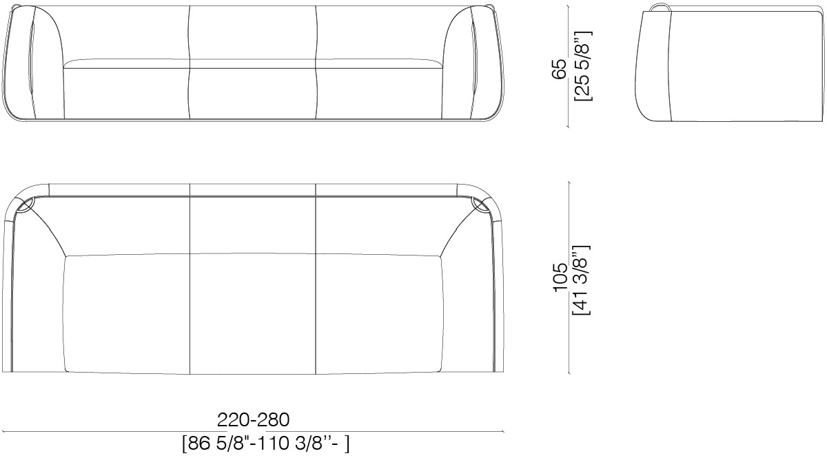Padded sofa, available in the two or three-seater version, covered in a leather, velvet or fabric tailoring. Equipped with feet.