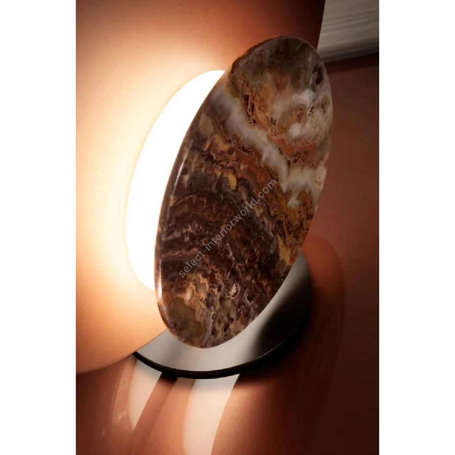 Table lamp with satin metal structure, and an interchangeable disc-shaped magnetic cover in onyx.