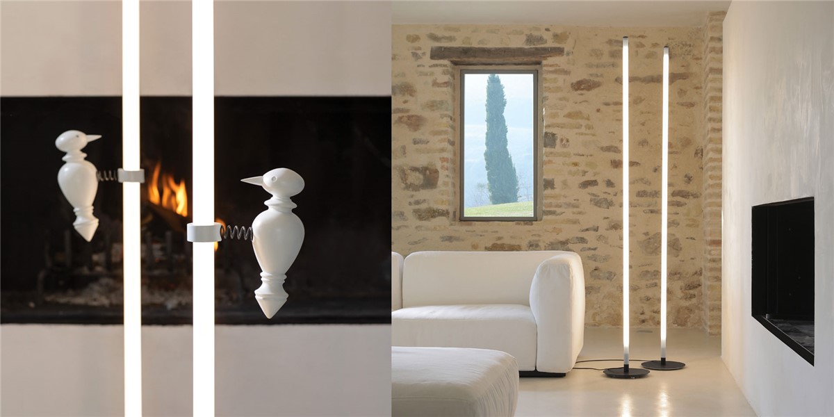 Accipicchio is a minimalist floor lamp inspired by the world of fauna: the axis of light, made of satin white glass, can be transformed by sliding a white woodpecker along the diffuser or connecting it with a thick black polyethylene net that attenuates the light.