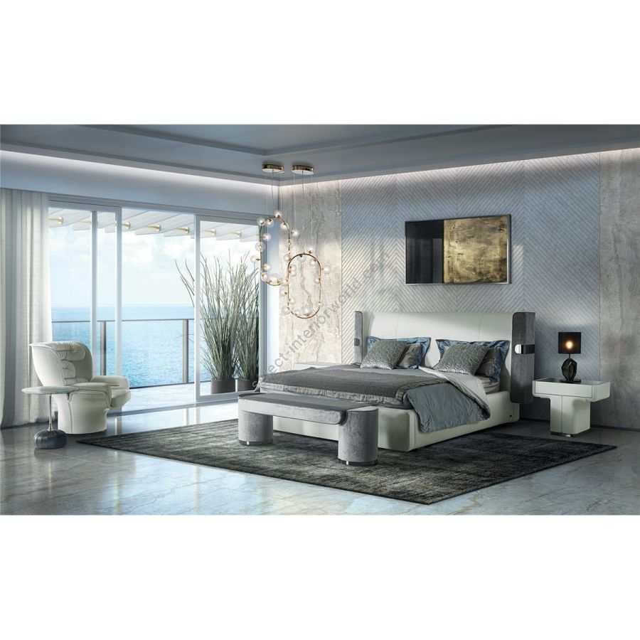 The structure is in wood covered in medium-high density polyurethane foam. The side of the headboard facing the wall is upholstered in cloth with the Longhi logo in the same colour as the bed upholstery, as a standard feature. The headboard is completed with an elegant metal ring available in the following finishes: Satin nickel, bright shaded brown, Black Rose gold, bright light gold, matt Champagne gold, bright chrome, bright black chrome, matt satin bronze, bright pink gold, matt pink gold. The base can accommodate: the fixed mattress base structure with height-adjustable wood slats. Sommier spring base for bed bases fitting flush with base, a convenient storage container that opens with two movements to maintain the mattress in a flat position. The bottom of the container is in laminated wood with a silky surface finish. A pair of wireless remote controlled electrified mattress bases, with motors integrated directly into the structure, which balance the amortised wood slat structure. Dedicated mattresses must be used with this type of bed base. Given the special manufacturing process, the bed-fabric or leather upholstery is not removable.