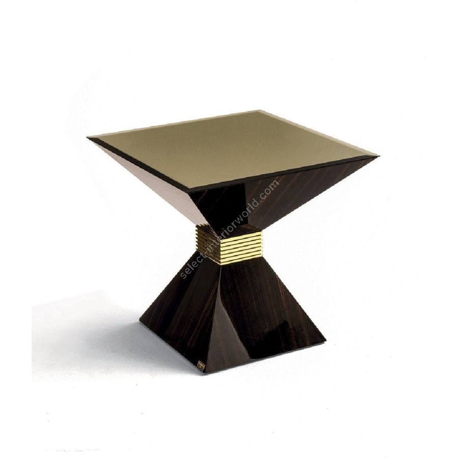 Series of small modular tables with pyramid shaped base available in different sizes and finishes. Wood structure: glossy lacquered wood in range colours, glossy/matt Maple, glossy/matt heat-treatedEucalyptus, glossy/matt Sycamore frisè, glossy/matt Ebony, glossy/matt Canaletto walnut. glossy walnut burl wood, upholstered in range leathers. Turned metal spacer: Satin nickel, bright shaded brown, BlackRose gold, bright light gold, matt Champagne gold, bright chrome, bright black chrome, matt satin bronze, bright pink gold, matt pink gold. Only the top part has an element in lighted honey onyx, or an element in metal, with stainless steel liner to use as a bottle holder or plant box. Top finishes: 4 mm bronze or smoky mirror with bevel 20mm, Marble with 20mm bevel: White Carrara marble, Imperial Brown marble, SaharaNoir marble (glossy and matt polyester finish), Dover White marble, Panda White marble, Guatemala Green marble, Corteccia marble, Port Saint Laurent marble, Red Levanto marble, Bardiglio Nuvolato marble, ElegantBrown marble, Shale Rosewood marble, Emperador Dark marble, Silver Wave marble, Agatha Black marble, Frappuccino marble, Calacatta marble, Fusion Light marble, Patagonia marble, Explosion Blue marble, Fusion Multicolor marble, Juliet Quartz marble, Calcite Azul marble, Azul Macauba marble, Portoro marble. Only for the container unit, the top is in metal as per sample finishes.