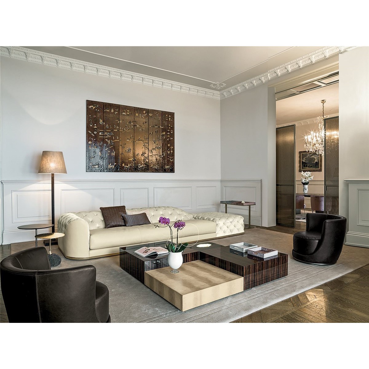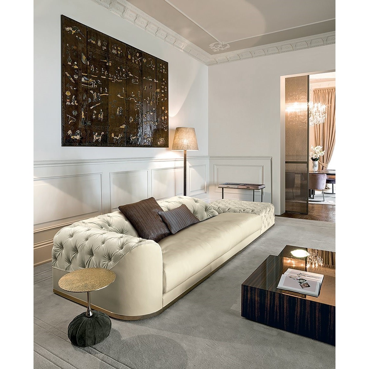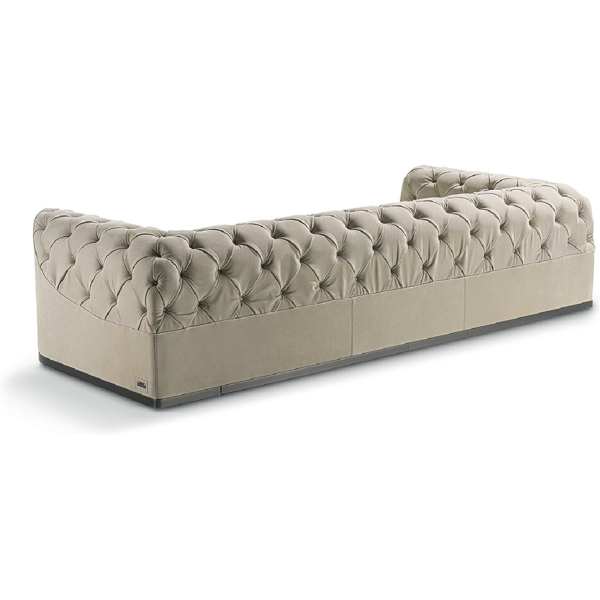 Frame in wood with elastic bands, covered in high density polyurethane foam. The backrest and part of the armrest is finished with tufted “Capitonné” handcrafted upholstery with plain coloured buttons or Swarovski crystal buttons. The seat cushion is covered in smooth triple density polyurethane foam, with a soft quilted cover in sterilised goose down. At the base of the sofa, there is a metal border in the finishes: Satin nickel, bright shaded brown, bright light gold, matt Champagne gold, bright chrome, bright black chrome, matt satin bronze, bright pink gold, matt pink gold, Black Rose gold. Given the particular process, the leather or fabric cover of the frame is not removable, but the seat cushion cover can be removed.
