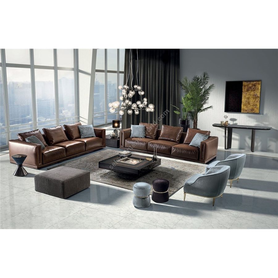 This collection of sofas and modular pieces that make it possible to form captivating compositions facilitates the development of contemporary design. Some concave elements are shaped to combine bar tables, poufs or other accessories. The wood structure sets on a surface made of poplar and fir plywood, and the entire piece is covered in high density polyurethane foam. Seat cushions feature multi-density polyurethane foam interiors with a rounded outer Memory Foam layer, all encased in soft sterilized goose down. The backrest cushions are in sterilised goose down. The elegant metal detail inserted in the armrest and the metal frame around the sofa base are offered in the following finishes: Satin nickel, Bright shaded brown, Black Rose gold, bright light gold, matt Champagne gold, bright chrome, bright black chrome, matt satin bronze, bright pink gold, matt pink gold. The upholstery CANNOT be removed from the structure, but the cushion covers in leather or fabric are removable. Small round bar table with structure upholstered in leather from the catalogue. Doors with push-pull opening. The interior houses a bottle-holder tray covered in leather from the catalogue (matched with the structure). Ground metal edges in the following finishes: Satin nickel, Bright shaded brown, Black Rose gold, bright light gold, matt Champagne gold, bright chrome, bright black chrome, matt satin bronze, bright pink gold, matt pink gold. Top finishes: bronze or smoky mirror, Portoro marble, Azul Macauba marble, White Carrara marble, Imperial Brown marble, Sahara Noir marble (glossy and matt polyester finish), Dover White marble, Panda White marble, Guatemala Green marble, Corteccia marble, Port Saint Laurent marble, Red Levanto marble, Bardiglio Nuvolato marble, Elegant Brown marble, Shale Rosewood marble, Emperador Dark marble, Silver Wave marble, Agatha Black marble, Frappuccino marble, Calacatta marble, Fusion Light marble, Patagonia marble, Explosion Blue marble, Fusion Multicolor marble, Juliet Quartz marble, Calcite Azul marble. Or in wood in the finishes: glossy/matt Maple, glossy/matt heat-treated Eucalyptus, glossy/matt Sycamore frisè, glossy/matt Ebony, glossy/matt Canaletto walnut, glossy walnut burl wood.