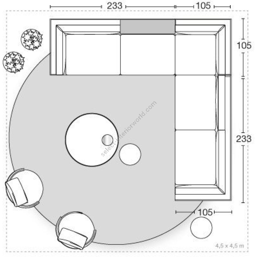Frame in wood with elastic bands, covered in high density polyurethane foam. Backrest and armrest cushions are in sterilised goose down, with insert in medium-density polyurethane foam, and seat cushions are in triple-density polyurethane foam covered in sterilised goose down and supported with Memory Foam padding in order to maintain shape more effectively. Sofa available in two versions: fully padded without base or with chromed metal ring in the following finishes: Satin nickel, bright shaded brown, Black Rose gold, bright light gold, matt Champagne gold, bright chrome, bright black chrome, matt satin bronze, bright pink gold, matt pink gold. The open corner element, which can be used in compositions or as a chaise longue end unit - end unit with padded utility shelf, or utility shelf in marble or backlit dimmable onyx. Given the special manufacturing process, the structure upholstery is not removable, but the leather or fabric covers of all cushions are removable. The sofa comes in two depths: 105 and 95 cm.