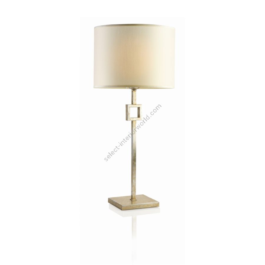 This table, bedside or desk model has a brass structure decorated with silver leaf, with strong geometry and lines and a cylindrical lampshade in ivory fabric.